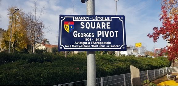 Ainsi, lors de la cérémonie du 11 novembre 2019, devant le monument aux morts, les habitants de MARCY L’ETOILE découvraient l’enfant du pays Georges PIVOT, qui s’était illustré entre 1923 et 1933 comme pilote des lignes LATÉCOÈRE et de l’AÉROPOSTALE aux côtés de MERMOZ et SAINT EXUPERY puis dans la toute nouvelle compagnie AIR FRANCE entre 1934 et 1935, avant de rejoindre la compagnie AÉROMARITIME – LES CHARGEURS RÉUNIS de 1935 à octobre 1939. Mobilisé dans l’Armée de l’air le 1er septembre 1939, il a tragiquement trouvé la mort le 1er octobre 1943 lors d’un vol d’essai sur un bombardier à Port Lyautey (aujourd’hui Kénitra)