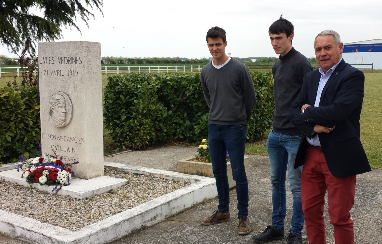 Dimanche 21 avril 2019, sur le terrain du Creux de la Thine à Saint Rambert d’Albon, les Vieilles Tiges représentées par Gilles NOVAT et Matthieu ROCHET en partenariat avec l’association Aéro rétro représentée par son président Ludovic PASCAL, ont rendu hommage à Jules VEDRINES à l’occasion du centenaire de sa disparition.