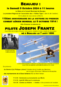 Tout d’abord Merci Monsieur le Maire, et la municipalité de Beaujeu d’accueillir l’Association Les Vieilles tiges Groupement Saint Exupéry à cet hommage rendu à Joseph FRANTZ à l’occasion du 110 ième anniversaire du premier combat aérien.