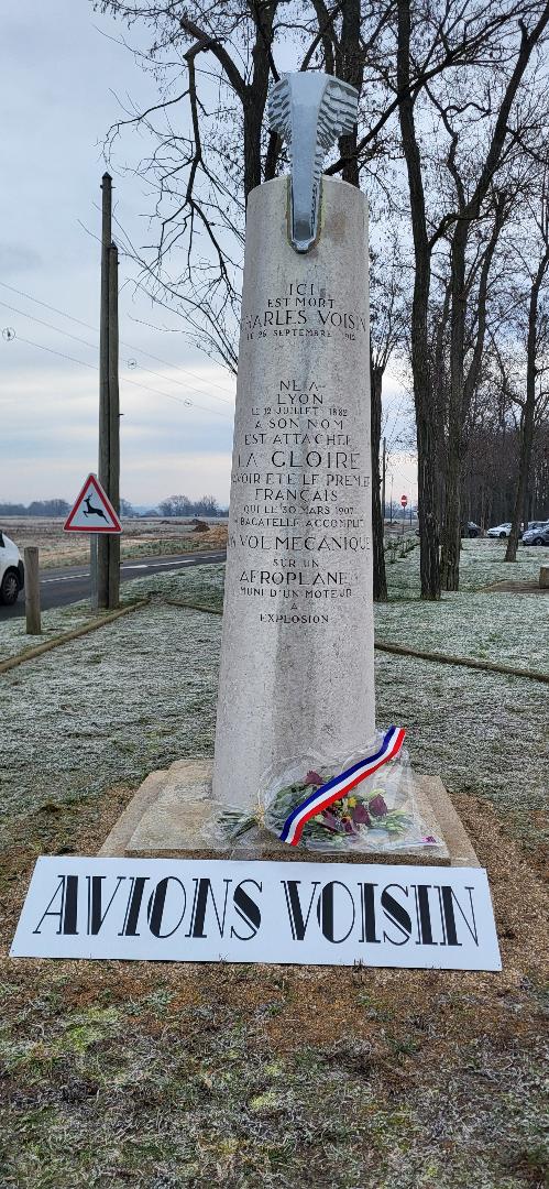 C’est par une matinée hivernale, à l’initiative de la Mairie de Corcelles-en-Beaujolais et des Amis de Gabriel Voisin, qu’une commémoration avait été organisée à proximité de ce village. Elle se déroula le dimanche 21 janvier 2024 à 10h30 au pied du monument restauré de Charles Voisin, proche de l’endroit où il trouva la mort, au volant d’une torpédo Hispano-Suiza. L’organisation prévoyait la présence de sa famille, d’élus, d’autorités locales, de l’Aéro-Club de France, de la fondation du Patrimoine, des associations locales et nationales et de l’association Les Vieilles Tiges. Nous avons pu rencontrer madame Sylvie LEQUEUX (petite nièce de Gabriel et Charles VOISIN), une belle délégation de l’association des amis de Gabriel VOISIN, du Maire de Corcelles et ses adjointes et agents municipaux, du Maire de Belleville et du Sénateur du Rhône (Auvergne-Rhône-Alpes). Trois Vieilles Tiges avaient fait le déplacement : Paul FOURRICHON, Aimé MARION (présent aussi la veille au Villars, pour rendre hommage à Gabriel VOISIN) et Jean-Paul FARGIER. En bon maître de cérémonie, Jean-Paul CHEMARIN, maire de la commune, nous accueillit par de chaleureuses paroles réconfortantes au regard de la météo ! Puis, après avoir rappelé le bien-fondé de cette action, il donna la parole au Maire de Belleville sur Saône, Monsieur Frédéric PRONCHÉRY puis à Monsieur Bernard FIALAIRE, Sénateur du Rhône (Auvergne-Rhône-Alpes). Nos élus ont tous rappelé l’importance de ce devoir de mémoire envers ces deux grands ingénieurs qui ont beaucoup apporté à l’aviation et à l’automobile. Enfin, Monsieur Philippe LADURE, président de l’association des amis de Gabriel VOISIN, fut intarissable d’éloges pour ces grands hommes. Enfin, nous observâmes une minute de silence en leurs mémoires ! Le maire de Corcelles nous convia à un apéritif dans une salle de la mairie heureusement chauffée. Nous avons eu la chance de découvrir des rares photos et film où on voyait Charles et Gabriel VOISIN. Elles étaient commentées par le président de l’association.