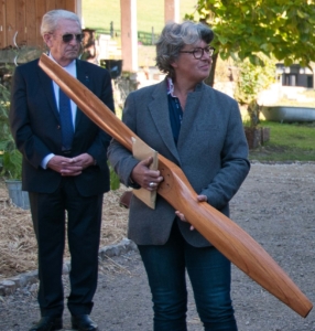 A l’issue de l’hommage, Madame Myriam MARQUES et Monsieur Stanislas PETIT ont reçu le livre du Centenaire des « Vieilles Tiges » rédigé par son président national le Général Yves RIONDET, puis Bernard TRIBLE président fondateur du Musée Aéronautique EALC de Lyon a remis à Madame Myriam MARQUES une hélice de sa collection personnelle afin de décorer le « Bar des pilotes ». Il est bon de préciser que cette hélice a équipé un appareil des années 30, semblable à celui sur lequel Jacques REMLINGER avait appris à piloter à Sywell, école de la Royal Air Force.