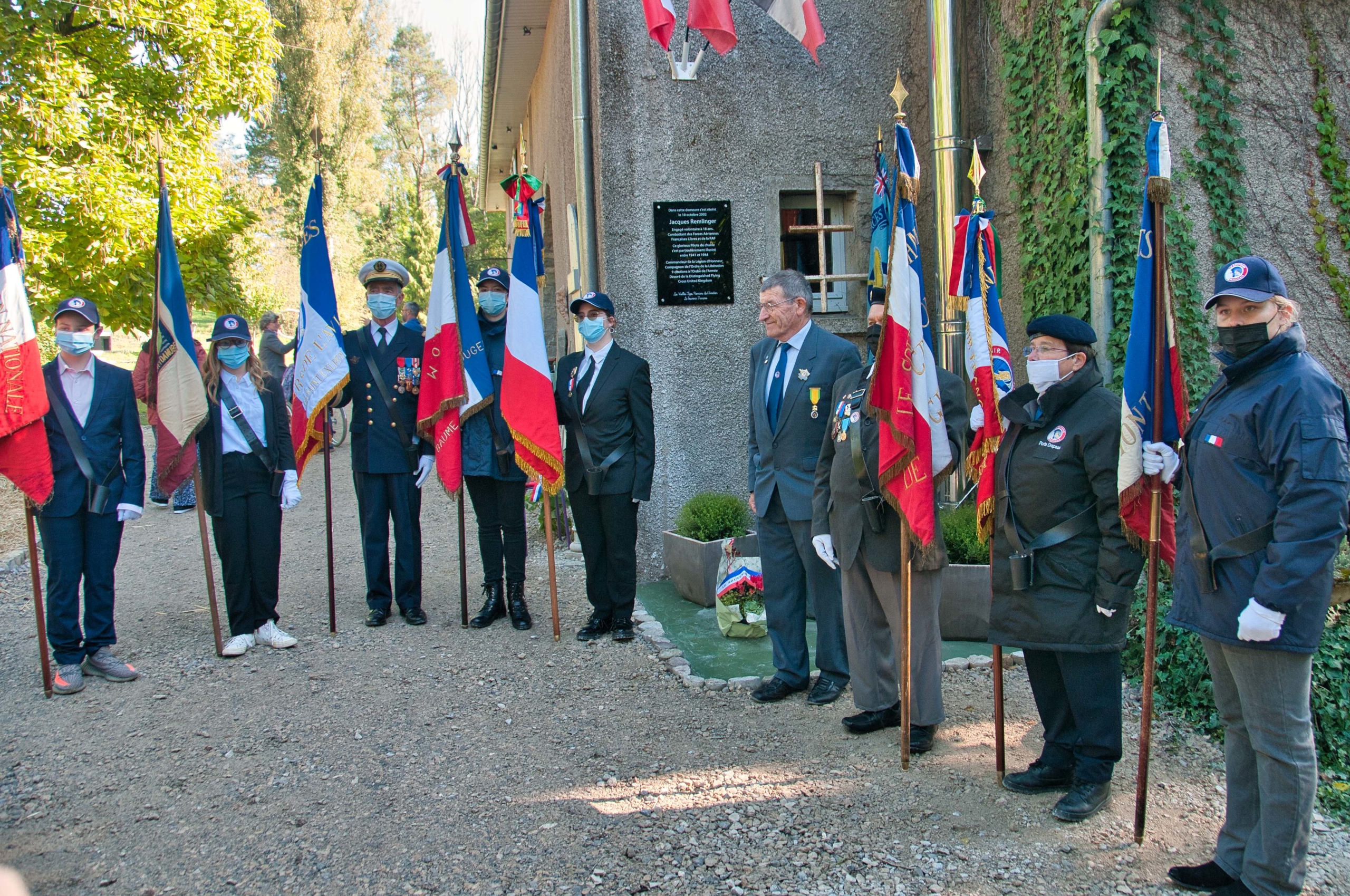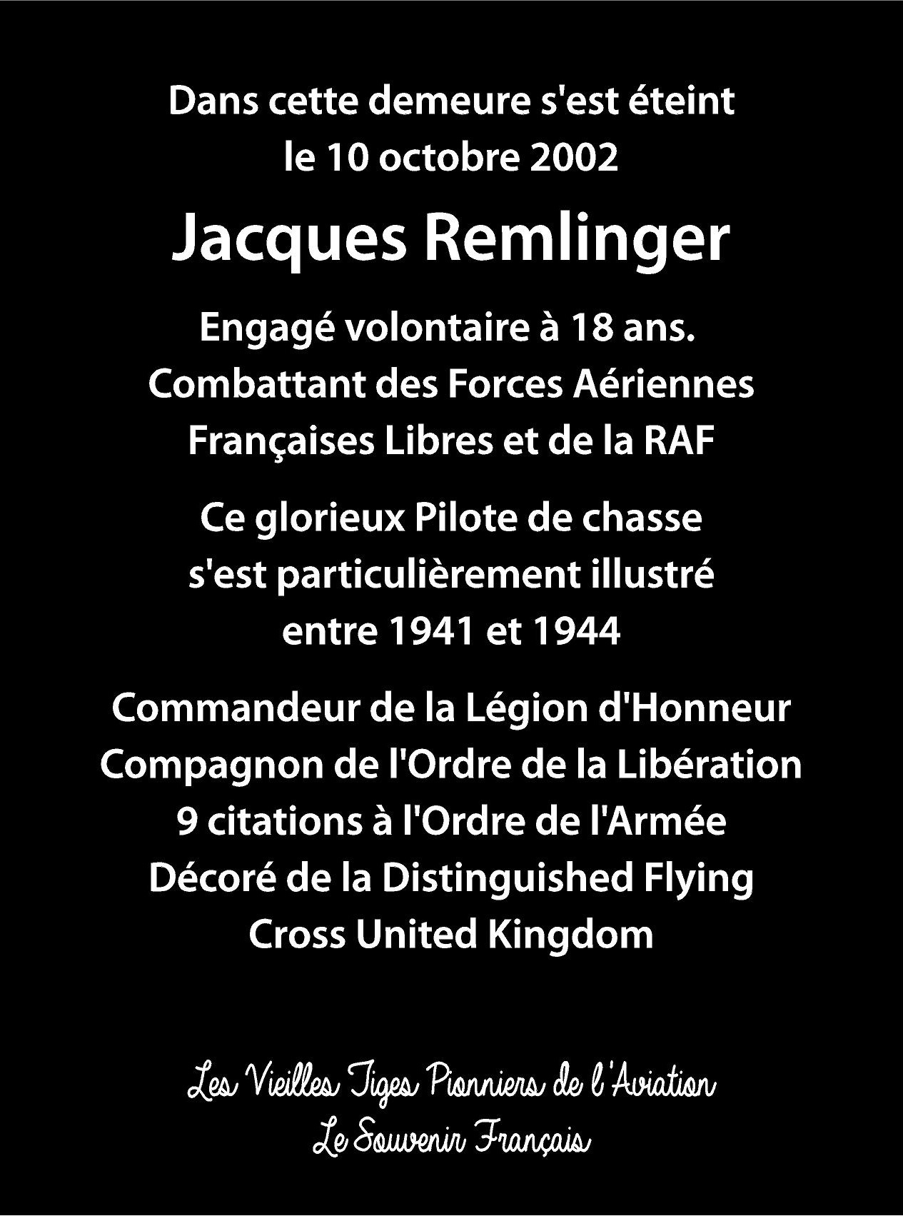 Sous l’initiative du groupement Saint-Exupéry et avec l’aide précieuse du « Souvenir Français », une plaque commémorative a été inaugurée sur la façade de cette demeure dans laquelle s’est éteint le 10 octobre 2002 Jacques REMLINGER pilote de la Royal Air Force et des Forces Aériennes de la France Libre qui, à l’âge de 18 ans avait répondu à l’appel du Général De Gaulle, le 18 juin 1940 (voir la rubrique « Des Hommes et des Ailes » de ce site).