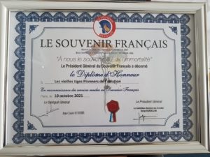 Pour clore cette magnifique matinée, avant de partager le verre de l’amitié offert par Madame MARQUES, Monsieur Stanislas PETIT a remis aux « Vieilles Tiges » le diplôme d’Honneur du « « Souvenir Français », gage d’une amitié sincère entre ces deux entités du Devoir de Mémoire.