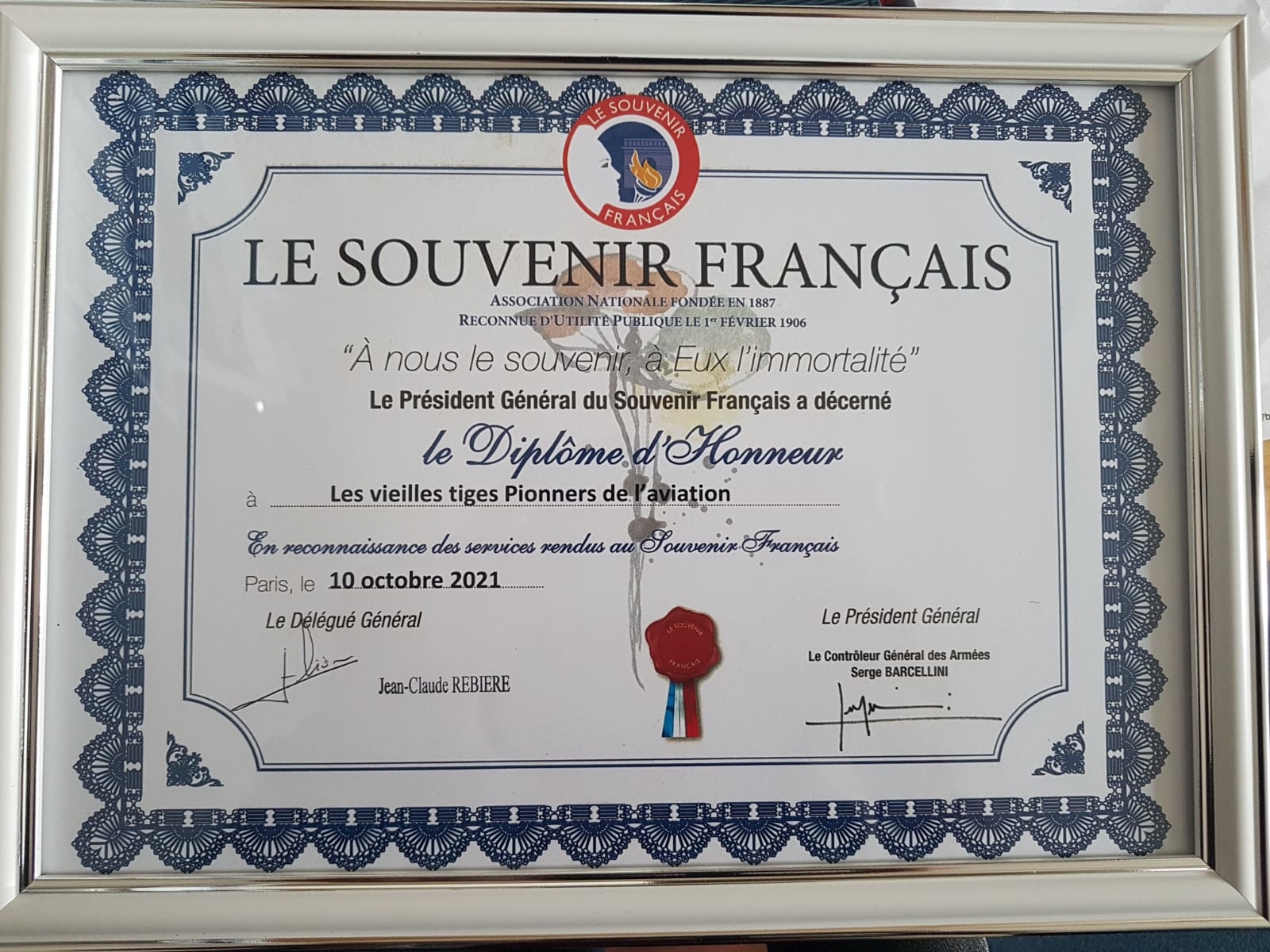 Le Diplôme D’HONNEUR remis aux Vieilles Tiges