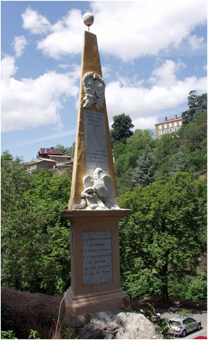 Quelques décennies plus tard, Barthélemy de Canson, gendre d’Etienne de Montgolfier fait édifier un obélisque commémoratif à quelques mètres du lieu de l’exploit. Surmonté d’un globe en marbre blanc, dans la partie haute, il présente les profils sculptés de Joseph et Etienne Montgolfier. Une plaque de marbre porte cette inscription :