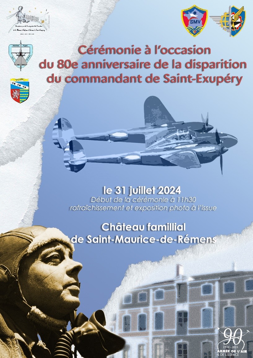 Il y a 80 ans, le 31 juillet 1944, disparaissait, au large de Marseille, aux commandes de son Lightning P38, notre grand aviateur écrivain, Antoine de Saint Exupéry. Il avait décollé de Borgo en Corse pour une mission de reconnaissance. Le groupement Saint-Exupéry des Vieilles Tiges se devait de lui rendre hommage ce 31 juillet 2024. Celui-ci fut réalisé en partenariat avec la municipalité de Saint Maurice de Rémens, de la base aérienne 278 d’Ambérieu et ses jeunes du SMV, de l’association pour la Sauvegarde et la Promotion de la Maison d’Enfance du Petit Prince (ASPME), et l’association Le Souvenir du Petit Prince. Une trentaine de nos membres avaient répondu présents à cette invitation. Cette très belle cérémonie débuta par un dépôt de gerbes au monument aux morts sur lequel figure le nom du grand pilote écrivain. Les autorités civiles et militaires, les portes drapeaux, les associations et de nombreux villageois, qui s’étaient regroupés autour du monument pour rendre hommage à l’enfant du pays. Mr le Maire, dans un discours élogieux honora sa mémoire. Puis, situé à quelques encablures du monument, nous nous dirigeâmes vers sa maison d’enfance pour une commémoration avec revue des troupes. Le colonel Solignac, commandant la base aérienne 278, nous fit la lecture de l’ordre du jour consacré au commandant Antoine de Saint Exupéry. Un passage de deux Rafales de la BA 113 de St Dizier et d’un Epsilon arborant sur son empennage la silhouette du Petit Prince rehaussait la solennité du moment. La matinée se termina par un buffet dans le parc du château et la découverte des différentes expositions autour du pilote/écrivain et du Petit Prince proposées par l’ASPME et la BA 278 d’Ambérieu en Bugey ainsi que le stand des Vieilles Tiges.