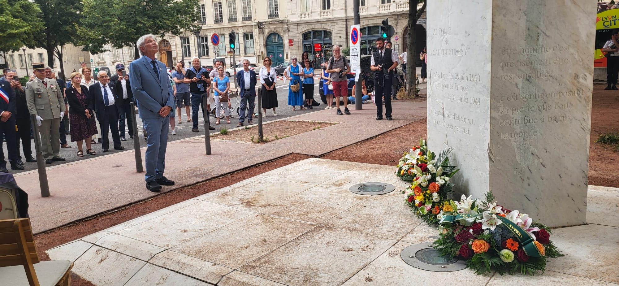 Des personnalités civiles et militaires, étaient présentes avec la participation de la base aérienne 942. Six portes drapeaux des différentes associations régionales du souvenir et aéronautiques dont les Vieilles Tiges groupement Saint Exupéry étaient présents. Philippe TREILLET, membre de notre groupement officiait en maître de cérémonie. Franck BEJAT qui est à l’origine du changement d’appellation de l’aéroport international de Lyon Satolas en « Aéroport Saint Exupéry » rappela la biographie de notre Ecrivain aviateur ainsi que l’origine de l’édification de ce monument situé au cœur de la ville de Lyon. Ensuite la parole fut donnée à Frédéric d’AGAY qui avec passion, nous décrivit son grand-oncle. A son tour, le maire de Lyon s’exprima pour rendre un bel hommage à Saint Exupéry dont les idées universelles sont toujours et surtout d’actualité …
